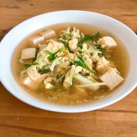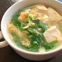 豆腐と水菜のふんわり卵スープのご紹介です。なめらかな絹ごし豆腐と水菜の食感に、ふんわりと卵でとじた中華スープがよく合います。具だくさんなので満足感のある一品に仕上がっていますよ。ぜひお試しくださいね。