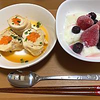 - 4 1をのせて巻き、耐熱容器に巻き終わりを下にして入れて、600Wの電子レンジで6分鶏むね肉に火が通るまで加熱します。