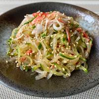 - 2 きゅうりは千切りにします。カニカマは手でほぐします。