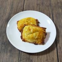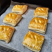 - 4 パイ生地を伸ばし4等分に切ります。3を乗せ、包みます。