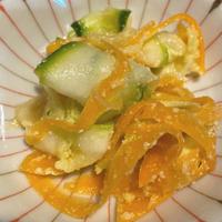 人参とズッキーニに塩をかけて一緒に水気を絞ったので柔らかいズッキーニの方が破れてしまいボロボロになりました;;