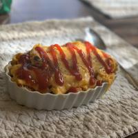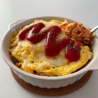 ふわふわ卵のオムドリアのご紹介です。ケチャップ味のごはんにふわふわの卵をのせ、とろとろのチーズで焼き上げたとてもおいしい一品です。ランチにもおすすめですので、ぜひお試しください。