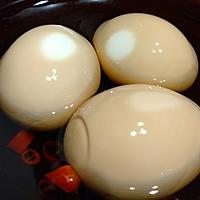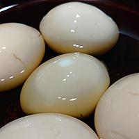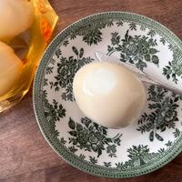 - 3 卵の殻をむき、ボウルに入れ、2を注ぎ入れラップをし、味が染みるまで冷蔵庫に入れて30分程置き漬けこみます。