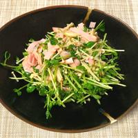 - 1 豆苗は種と根を切り落とし、半分に切ります。ハムは5mm幅の細切りにします。