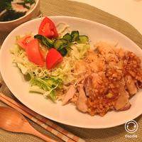 - 6 ごはん、5の食べやすい大きさに切った鶏もも肉、ベビーリーフ、ミニトマト、バジルを皿に盛り付けて、粗挽き黒こしょう、4をかけて完成です。