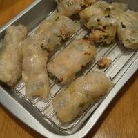 - 3 ライスペーパーをお水につけ絞ったふきんの上に乗せます。2の具材を乗せて巻いていきます。170℃の揚げ油で揚げます。