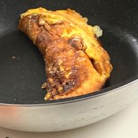 - 3 フライパンを強火にしオリーブオイルを入れ2を流し入れたら、軽く混ぜた後ピザ用チーズを入れて卵をふんわり折りたたみ、フライパンから取り出してお皿に盛っておきます。