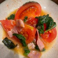 寒かったので材料そのまま、ベーコン→オリーブオイル→トマト→調味料→火を止める直前にバジルの順にサッとフライパンで炒めて温サラダに。