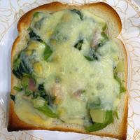 - 6 食パンに5をのせ、ピザ用チーズをのせたらアルミホイルを敷いた天板にのせてトースターで5分、チーズに焼き色がつくまで焼きます。