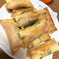 - 2 春巻きの皮に1、ピザ用チーズ、ウインナーをのせて手前から巻き、巻き終わりに水溶き薄力粉を付けて留めます。同じように3個作ります。