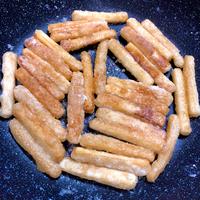 - 4 フライパンの底から2cmほどの揚げ油を注ぎ、170℃に熱し、衣に焼き色がついたら油を切ります。