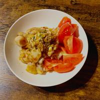 - 7 お皿に6、レタス、トマトを盛り付け、5をかけて完成です。