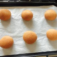 - 6 軽く生地を押さえてガスを抜いたら丸め直し、クッキングシートを敷いた天板に乗せます。