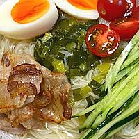 ごま油とニンニクが香る爽やかなスープが特徴で、暑い季節にぴったりのさっぱりとした一品です。トッピングは豚バラ肉やゆで卵が定番ですが、キムチやトマト、きゅうりなど具材のアレンジは自由自在。ラー油や柚子胡椒を加えても美味しく、スルスルと箸が進みます。スープは氷水で手早く冷やすと、より一層美味しくいただけます。