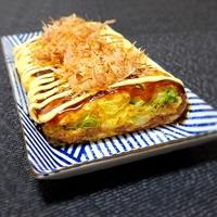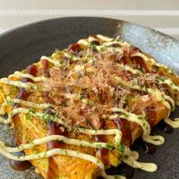 - 4 食べやすい大きさに切り、お皿に盛り付けます。トッピングをかけ、お好み焼きソースを添えて出来上がりです。