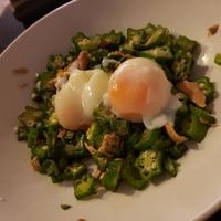 冷凍オクラ+既製品の温泉タマゴで簡単に完成。調味料の加減が難しいようで、気持ち薄味にしたらかなり美味。