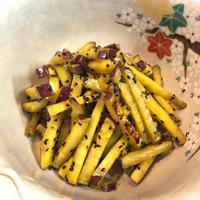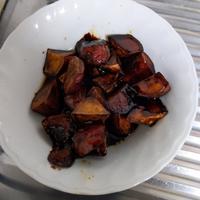 1回目の時は美味しく作れたけど、次はもっと簡単に,甘じょっぱくしたくて次の日に作りました。水にさらした後にレンジで600w3分半する事によってフライパンで焼く作業が短縮。そのまま砂糖、味醂、醤油、酢を入れて完成。残念なのが黒ゴマ忘れた。こっちの方が早い上に手間なく、洗い物も少なかったので、今後はこれでします。