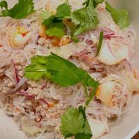 爽やかな酸味とパクチーの香りが特徴的なタイの定番サラダです。春雨をベースに、海老や鶏ひき肉、トマト、きくらげなどお好みの具材をアレンジできます。レモンやライムの酸味、ナンプラーの旨味、そして刻みピーナッツのカリカリ食感がアクセントに。砂糖は控えめにし、レモン汁を多めにすることで本場の味に近づきます。暑い時期にぴったりのヘルシーメニューです。