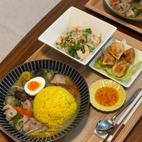 茹でる工程は同じお湯で済ませ、タレに茹で汁を少し加えてます。紫玉ねぎの代わりにホムデン使用、コブミカンの葉の千切り追加、砂糖はパームシュガーにしつつ1/3程度に減らし、刻んだピーナッツをトッピングしてます。
