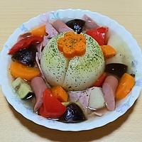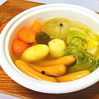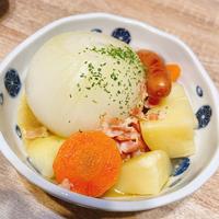 野菜たっぷりのポトフで美味しいです。ニンニク無し、ホールのクローブと黒胡椒を加えて煮込み、野菜はレンチンしないで時間差で入れてます。