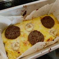 - 5 スライスしたバナナとクッキーを上にのせ、180℃に予熱したオーブンで25分加熱します。