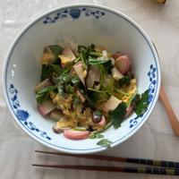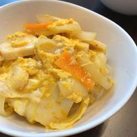 - 4 フライパンに2、3、お湯、(A)を入れてひと煮立ちさせたら1、溶き卵を流し入れ、卵が固まるまで中火で加熱し、火から下ろします。