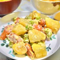 - 3 じゃがいもは一口大に切ります。耐熱ボウルに移し、ふんわりラップをかけて、600Wの電子レンジで5分程、竹串が通るまで加熱し、粗熱を取ります。