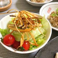 揚げる前に必ず水気はちゃんと取るようにしてください。水が付いていると揚げている時に油がはねて危ないです。揚げ過ぎるとごぼうが縮んでしまい風味も飛ぶので気をつけながら引き上げるタイミングを気をつけてください。