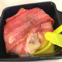- 2 薄切りロングベーコンを放射線状に並べてモッツァレラチーズを真ん中に乗せて包みます。