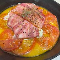 - 3 スキレット鍋にスライスしたトマトを並べて2を真ん中に乗せます。