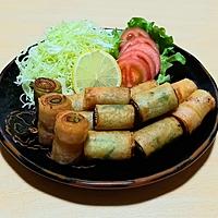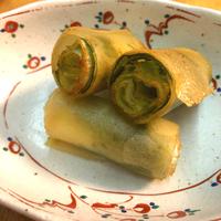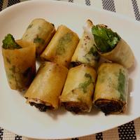 春巻きの皮に、長ねぎと大葉を巻いてサクッと揚げました。梅肉と大葉の風味がアクセントになり、さわやかな一品ですよ。お酒のおつまみにもなりますので、ぜひお試しくださいね。