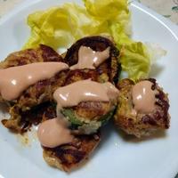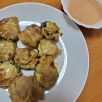 ズッキー二のシシカバブ風のご紹介です。豚こま切れ肉でズッキーニを巻いてジューシーに仕上げました。ソースはマヨネーズとケチャップでお手軽に作れますよ。スパイシーで甘辛い味付けがやみつきになること間違いなしなので、ぜひお試しくださいね。