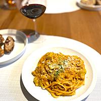 スパゲティを茹でずに水につけて少しふやかしておくことで、手間が省け、モチモチ感が出ます。 又、同時にスパゲティの粉っぽさもとることが出来ます。 煮詰めた後にも生クリームを加えるので、煮詰めた時のソース量は少なくて大丈夫です。