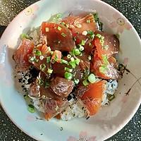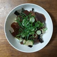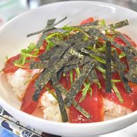- 6 粗熱が取れた3に5のカツオをのせ、漬け汁を大さじ1かけ、1、残りのトッピングを散らして完成です。