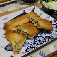- 3 春巻きの皮をひし形になるように広げて置いたら、2とピザ用チーズを乗せて春巻きの形に包みます。