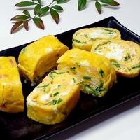 - 4 弱火にして、2をフライパンに流し入れ、半熟状態になったらその端から巻いていきます。