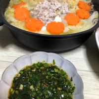 - 6 土鍋にスープの材料を入れて混ぜ合わせて中火にし、煮立ったら3、5を入れて蓋をして15分程煮込みます。