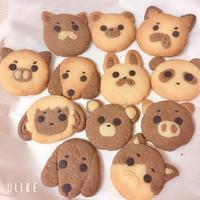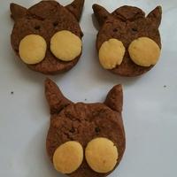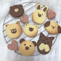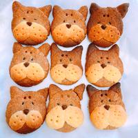 プレーンココアを混ぜたクッキー生地でわんわんを作りました。お子様と一緒につくると楽しいですね。目の形、眉の場所、口の形や耳の形や色などを変えるといろいろな表情やさまざまな犬種が楽しめます。おやつやパーティにぜひ、お試しください。