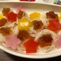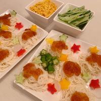 きらきらのめんつゆジュレでいただく、とっても可愛らしいそうめんのご紹介です。七夕をイメージしてお星様をたくさんちりばめてみました。テーブルもとっても華やかになること間違いなしですよ。お子様と一緒に楽しく飾り付けをしてみてくださいね。