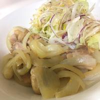 耐熱皿へ白菜、もも肉、玉ねぎの順に乗せて3分チン、水溶き片栗粉加えてぜーんぶ混ぜて、3分チンしました。