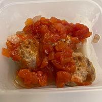 - 2 沸騰したお湯が入った鍋に、フォークで刺したトマトを入れ、皮が剥けてきたら取り出します。皮と種を取り除き、5mm角に切ります。