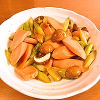 魚肉ソーセージとアスパラガスを使った手軽な一品で、切って炒めるだけの簡単レシピです。にんにくの香ばしい風味が食欲をそそり、バターのコクと調味料の絶妙なバランスが魅力。きのこ類(マッシュルーム、シメジ、シイタケ)を加えるとさらに美味しさアップ。お弁当のおかずとしても活躍する彩り豊かな一品で、子供からも好評です。