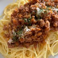 濃厚ミートソースパスタはいかがでしょうか。シンプルな材料ですが、赤ワインを入れて煮込むことでお手軽に濃厚なミートソースに仕上がりますよ。ひき肉の種類を代えると、また違った味わいが楽しめます。ぜひお試しくださいね。