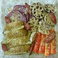 レンコン、長芋、ネギ、ブロッコリーで作りました。根菜がいいですね。ブロッコリーは焼きすぎでした。