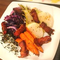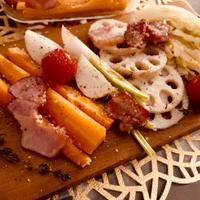 彩り鮮やかな紫キャベツと根菜をじっくりとオーブンで焼き上げました。香ばしい粉チーズと旨みたっぷりのベーコンがアクセントです。見た目もインパクトがあるので、おもてなし料理にぴったりです。ワインにもよく合いますよ。