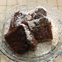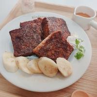ココアフレンチトーストはいかがでしょうか。ココアを加えた卵液がたっぷりと染み込んだ食パンをバターで香ばしく焼きました。甘くてとてもおいしい一品です。朝食や、おやつにもぴったりですよ。ぜひ作ってみてくださいね。