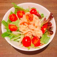 - 5 4に3を入れて和えたら、ベビーリーフを盛ったお皿に乗せて完成です。