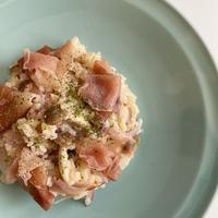 レシピの材料がなかったのでいろんなもので代用しましたが、味付けはレシピ通りです!牛乳気持ち少なめ(120mlくらい)、しめじ、紫玉ねぎ1/4、仕上げに生ハムを載せました。最初に紫玉ねぎを透明になるまでオリーブオイルで炒め、しめじを入れて、白ワイン、牛乳、コンソメ、塩コショウで完成でした🙆♀️