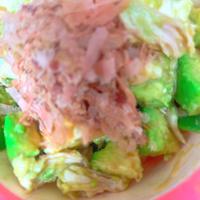 - 2 アボカドは皮を剥いて種を取り、1cm角にします。