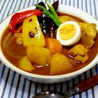 札幌発祥のスープカレーをお家で手軽に作れるようにアレンジしました。スープカレーは、さらさらとしたスープ状のカレーにごはんを浸して食べるスタイルが定番です。今回はトッピングにズッキーニ、パプリカ、ナス、ゆで卵をのせましたが、お好みの野菜でアレンジしてもおいしいですよ。ぜひお試しくださいね。